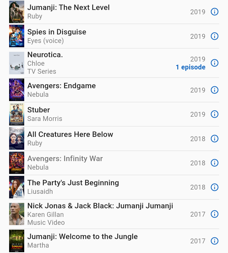 Well, there is also the Jumanji saga, whereby she portrayed the same playable Jumanji-redux character in Welcome to the Jungle and The Next Level, the two installments thus far in the soft reboot franchise of the original movie and its cartoon spin-off.