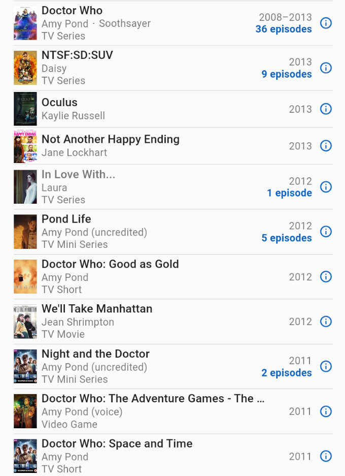 You might want to add either specifically (itemized) or generally ("various shorts and videos") these three characters Nebula, Amy Pond and Martha Kaply appear in too, in addition to the feature films and TV movie appearances. Here is a small sampling,