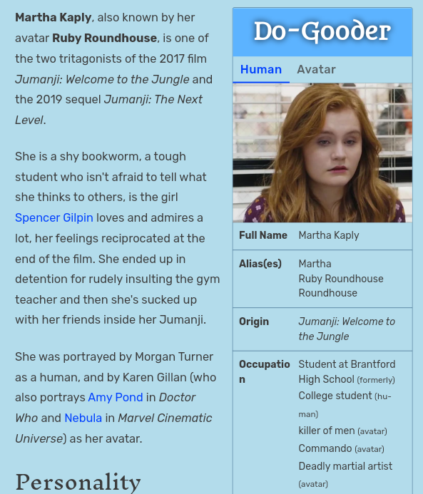 I kind of understand, but it really sort of boils down to the definition of the word "character" as it pertains to story elements, since the definition of the word "saga" is contingent upon that. In a way, Ruby Roundhouse (likewise with Smolde Bravestone, Mouse Finbar, Shelly Oberon and Seaplane McDonough) doesn't actually exist within the fictional universe of the Jumanji movies, so she cannot possibly be her own actual character, based upon what the franchise has revealed thus far, as the avatar cannot be rendered into the game absent a player to inhabit it, despite having unique "stats" and even apparently something of a biography. The existence of those character stats really does sort of obfuscate the matter, especially considering that these are life-action portrayals rather than cartoons.