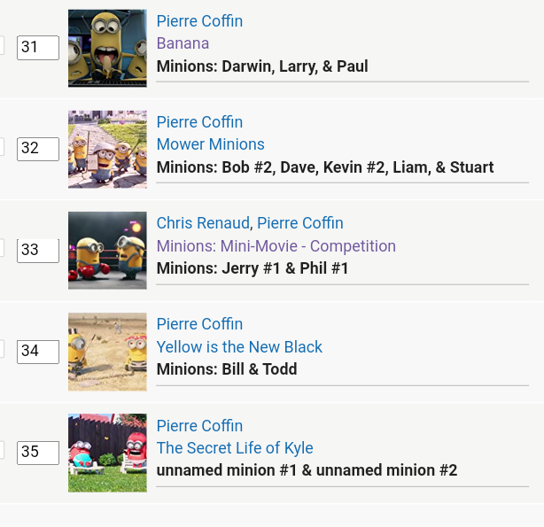 See the 3 option image Face-Off of 'Despicable Me', 'Minions' or related franchise mini-movies minion characters here: https://www.imdb.com/list/ls021621742/