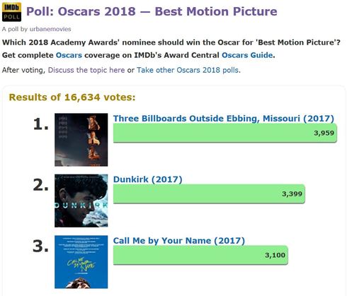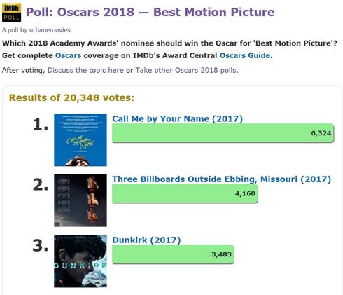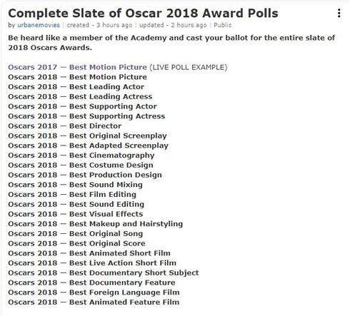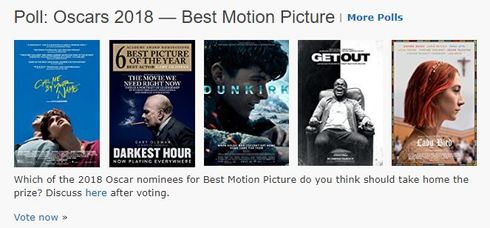 24 Febuary 2018: Oscars 2018 — Best Motion Picture - http://www.imdb.com/poll/C1aTYKvzZps/ (A poll by urbanemovies)