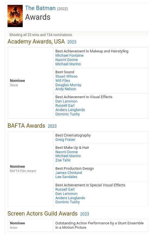 3 Oscar noms for The Batman (2022). Neither merits a watershed distinction, IMHO.