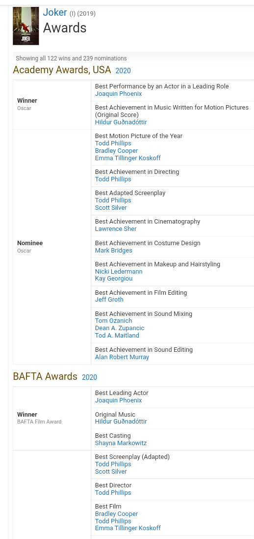 Best Picture (Pending), Best Director (Pending), Best Writing - Adapted Screenplay (Pending), Best Lead Actor (Pending), Best Cinematography (Pending), Best Makeup and Hairstyling (Pending), Best Costume Design (Pending), Best Film Editing (Pending), Best Original Score (Pending), Best Sound Editing (Pending), Best Sound Mixing (Pending)