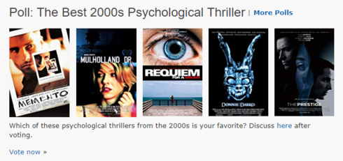 06 September 2018: The Best 2000s Psychological Thriller - https://www.imdb.com/poll/5x2Mrz9INX4/ (A poll by pere-25366)