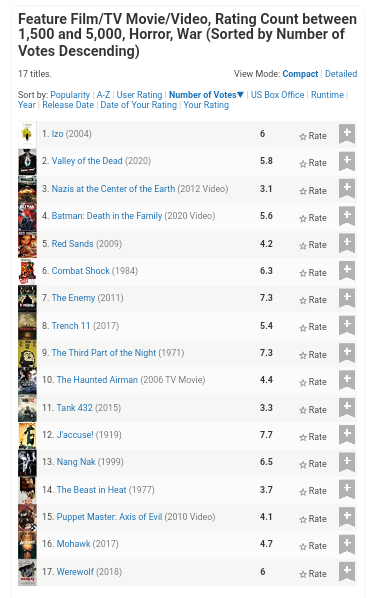 https://www.imdb.com/search/title/?title_type=feature,tv_movie,video&user_rating=5.0,10.0&num_votes=1000,&genres=horror,war&sort=num_votes,desc&view=advanced