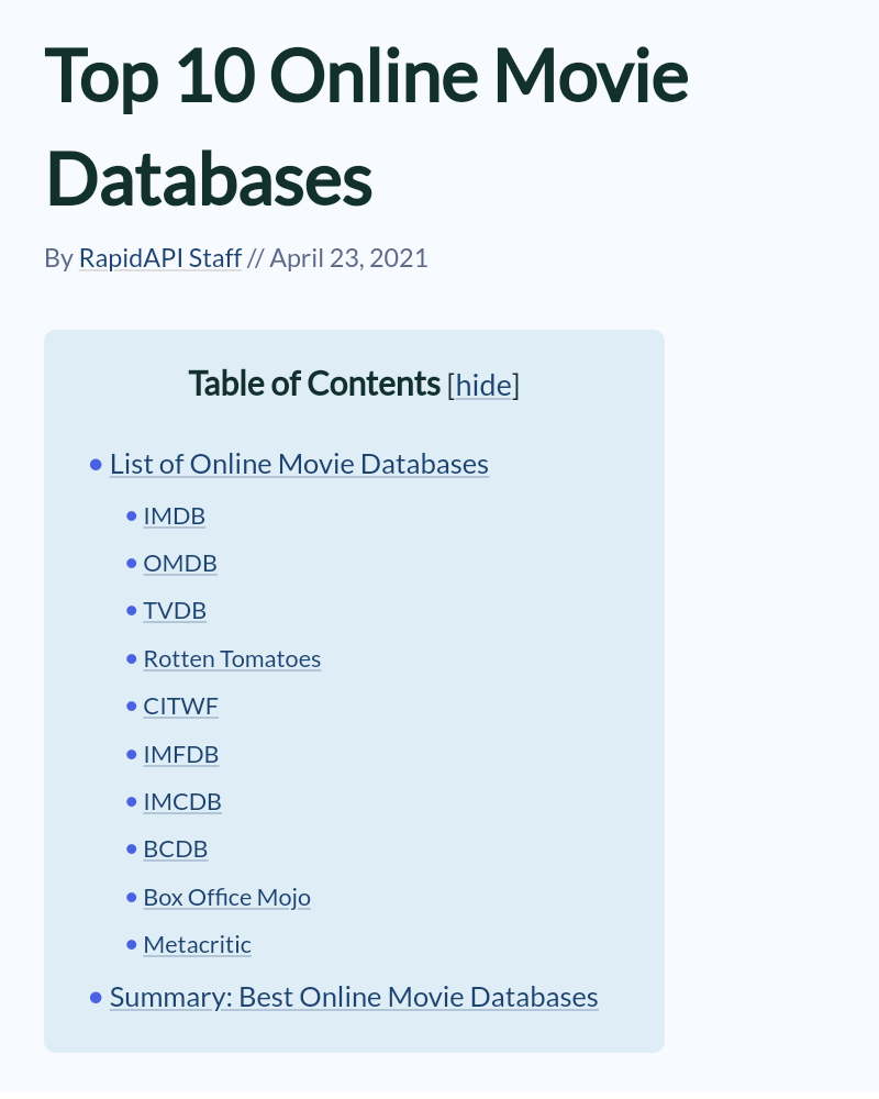 Two corrections, already. Also, I would suggest using hyperlink to link here @ Top 10 Online Movie Databases, and here @ Rapid API Blog in the introduction to the website article you used as your source. It will act as your footnote. https://rapidapi.com/blog/list-of-online-movie-databases/
