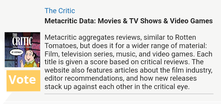 I like this poll suggestion a lot, but I would suggest a couple of items that should be addressed, IMHO. 1) A better question might help. I don't think most people have gone to half these sites, so I don't think they would know which one is best. Plus, I expect they are all excellent at the niches they have carved out. Wouldn't a question that doesn't require prior site visits be better? Maybe, ask which one is the most surprising one to exist or which is the one they are most interested in visiting or which one has the most value to them for the types of media they watch, or another question to your liking. 2) I think the suggestion would benefit from better or more appropriate images, like gun imagery for the firearms database, a famous car like the Batmobile or Mad Max's Ford GT Falcon for the car database, or a killer tomato for rotten tomatoes and so on. I don't know how the Minions tie-in here to these specific websites. 3) You should qualify and say " According to" as a preface to where this top ten list is coming from and then cite and thank them as a source for your copied recaps. Maybe, even hyperlinking to the original article 😇 4) It should be easy for poll takers to take your poll. Maybe, bolding the database name and placing a space between the title and the text explanation to be able to quickly review and identify the answer options. and 5) Lastly, Box Office Mojo is not listed with its take on the financial side of the movie business, so you only list 9/10 options from a top ten list.