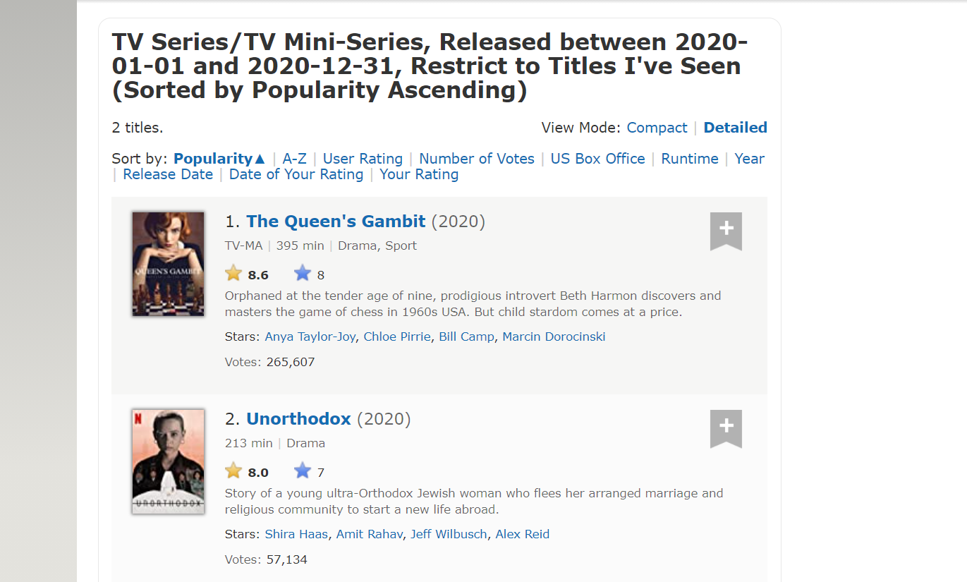 From the two shows that I have seen in 2020, my favorite is The Queen's Gambit
