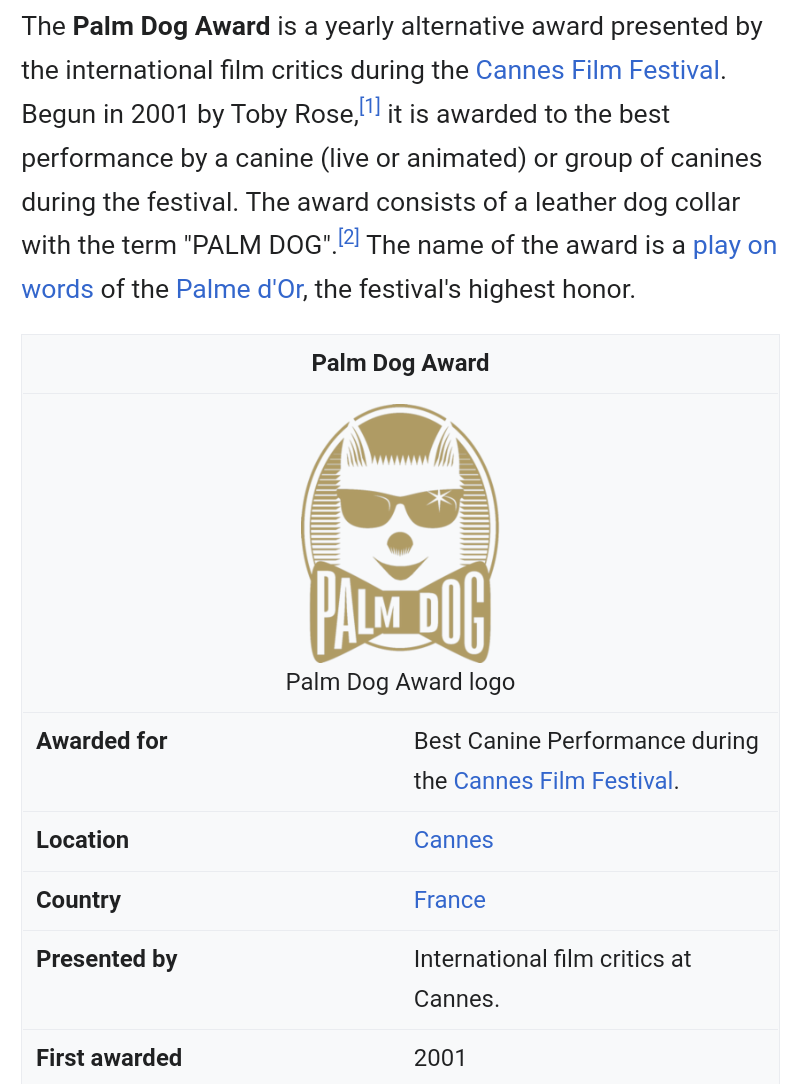 Wiki: The Palm Dog Award is a yearly alternative award presented by the international film critics during the Cannes Film Festival. Begun in 2001 by Toby Rose, it is awarded to the best performance by a canine (live or animated) or group of canines during the festival. The award consists of a leather dog collar with the term "PALM DOG". The name of the award is a play on words of the Palme d'Or, the festival's highest honor.