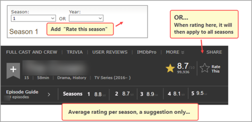 Would you please consider making a rating per season for the series and not only for the individual episodes. As TV series quality varies from season to season, it would be great to rate whole season and not individually episode by episode.