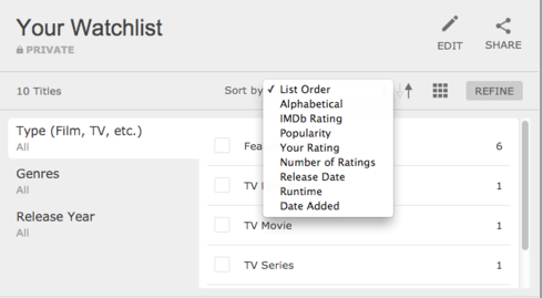 Why is there no way to sort ratings for individual users, other than Most Recent of Top Rated? Couldn't we also be allowed to sort alphabetically or by date of title?