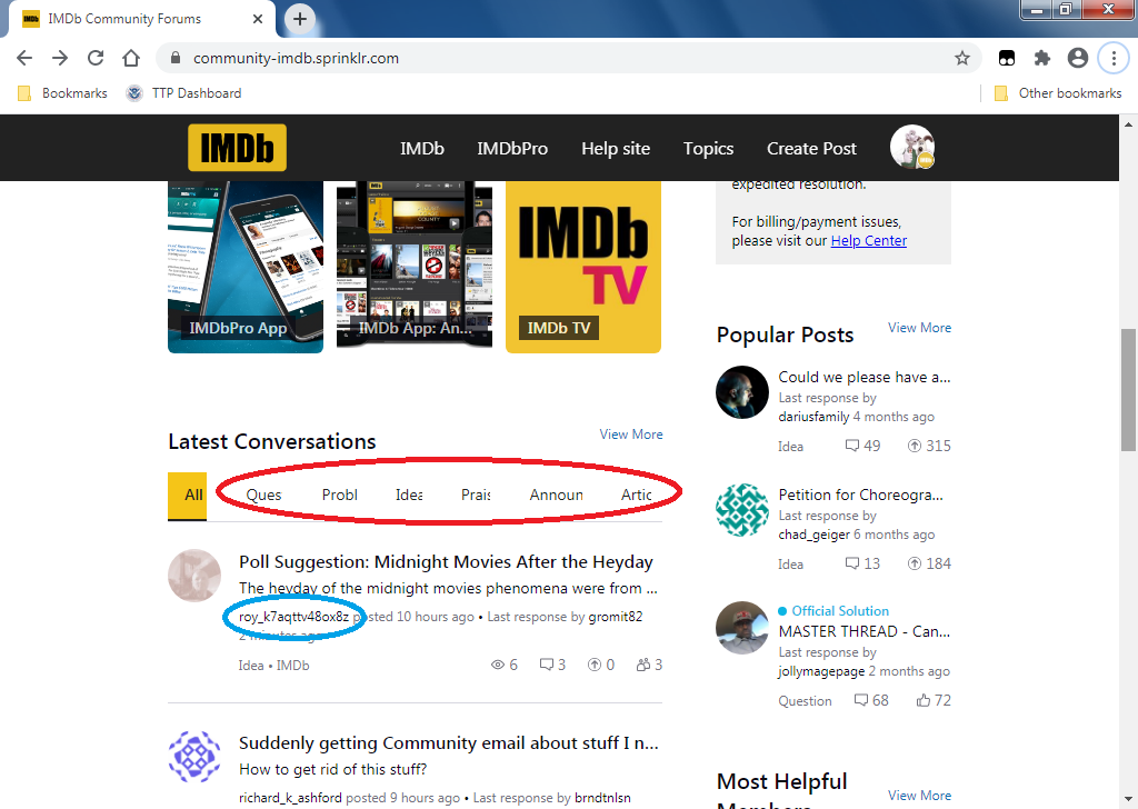 Also, in the blue oval, the contributor who posted the topic is identified as "roy_k7aqttv48ox8z". But that's not their user name. As seen on the thread itself (https://community-imdb.sprinklr.com/conversations/imdb-poll/poll-suggestion-midnight-movies-after-the-heyday/5f4eaeec4833935f0917fd58), their user name is Hoekkie and that's how I assume they want to be identified.
