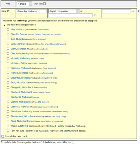 Well, at least this time some suggestions are names with credits in the Visual Effects department... None of them has "Nicholas Giassullo" as an aka but, to verify this, we have to check the name pages of many of them because an eventual exact match isn't displayed... Fortunately, I took the precaution of performing another search before resigning to mark "This is a different person not currently listed", and found Mr. Sullo, but this shouldn't be necessary.