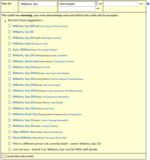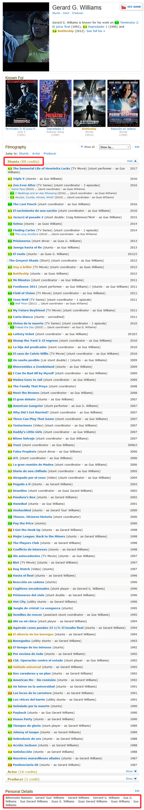 None of them has Stunts as their primary job and, besides the three exact "IMDb name" matches (first three results), all the others seem to appear there just because of their name similarity (Gus/Guy, ok...), without considering other factors (only 2 of the 20 name suggestions have at least one stunt credit)... How is it possible that Gerard G. Williams (the correct person), with over 80 stunt credits and a NAKA that exactly mirrors the search term, doesn't show up among the results?