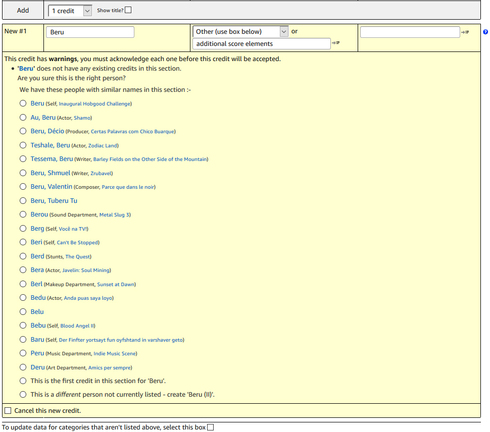 The five exact matches are displayed first (understandable), despite none of them has "Sound" as their primary job. Then, 15 names appear, of which only 2 are known by their sound work... Since primary jobs aren't necessarily exclusive I even checked all the five exact matches to verify they never worked in the Sound field. As you can see, I was about to create a sixth instance of "Catherine Rose", but I thought it weird that she was the only person credited in that department who didn't have a page, so fortunately I was cautious enough to perform a collaborations search (via Google) and Katherine Rose (I) quickly shows up: