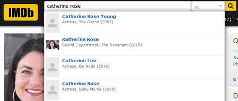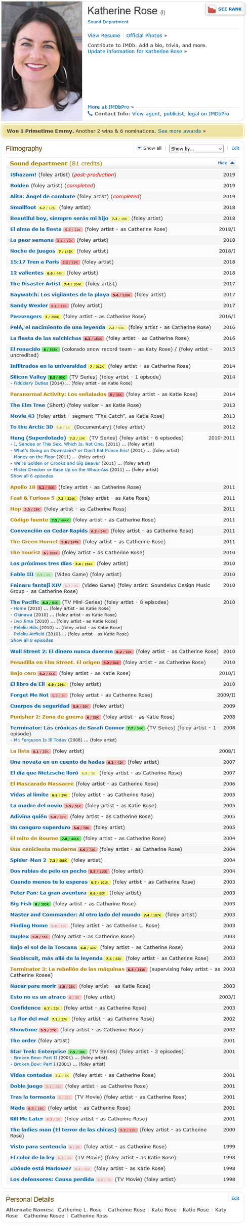 Note that she's a person with a vast experience in the Sound department (Emmy winner, STARmeter around 200k). Also, that's the only department where she has credits. And also, she's been credited as "Catherine Rose" in over 40% of her titles (35 of 81). Moreover, if you type "Catherine Rose" in the standard search bar, you'll get Katherine Rose (I) as the second suggested result.