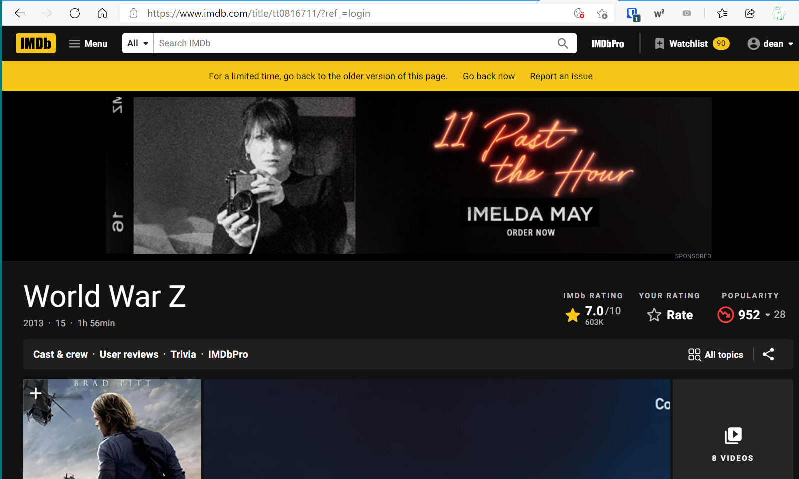 like the new layout. the Add To Watchlist combo is clear. Ratings easier to view/get to. The Advert Banner uses too much prime real estate.. first half of browser window before i get to the movie, initially i thought the star ratings applied to the Ad content. 11 past the hour :-)